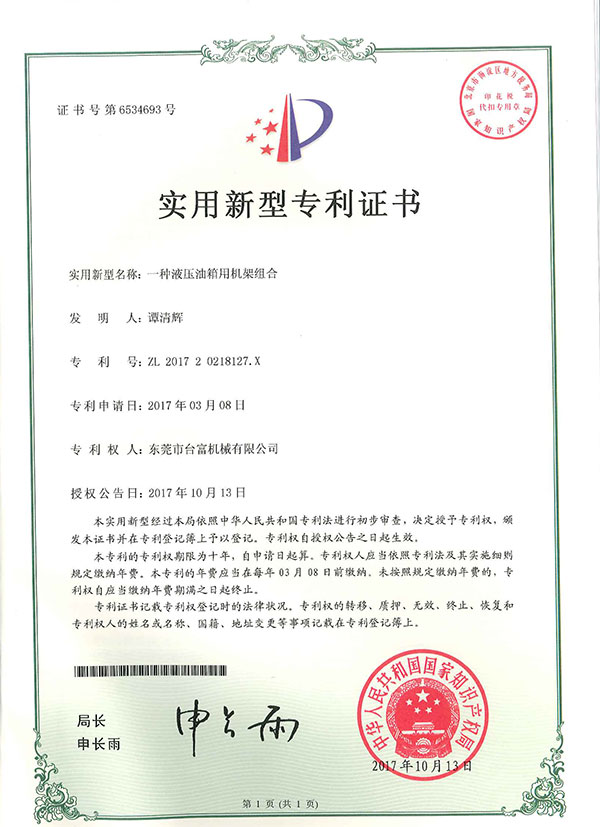 一種液壓油用機(jī)架組合專利證書